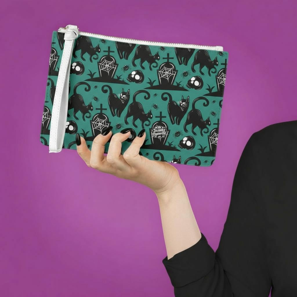 Unveil your darkly charming side with this Mystical Cat Graveyard Clutch 🐈⬛✨ — a perfect fusion of gothic elegance and playful whimsy. Crafted with a saffiano-style pattern, this enchanting clutch features mystical cats, playful graves, and a vibrant design that turns every outing into a statement. Whether you’re heading to a festival, spooky soirée, or just running errands with flair, this clutch adds a dose of witchy personality to your look.