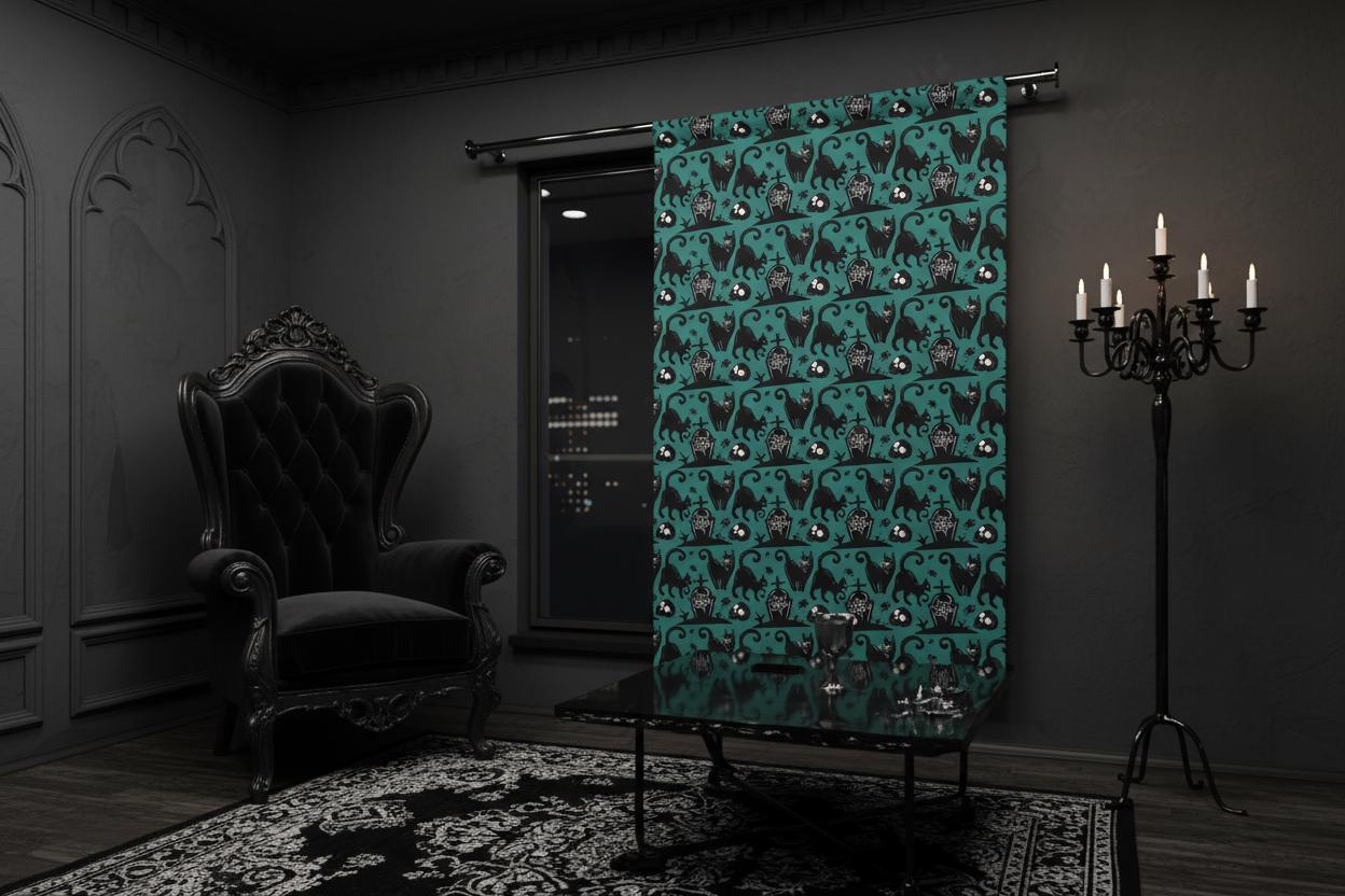 Set against a deep teal background, the repeating silhouettes of sly black cats, curious skulls, curling vines, and grave motifs create a playful gothic scene that feels both cozy and mysterious. Whether you’re styling a bedroom, movie room, or reading nook, this curtain helps dim the light while adding instant atmosphere.