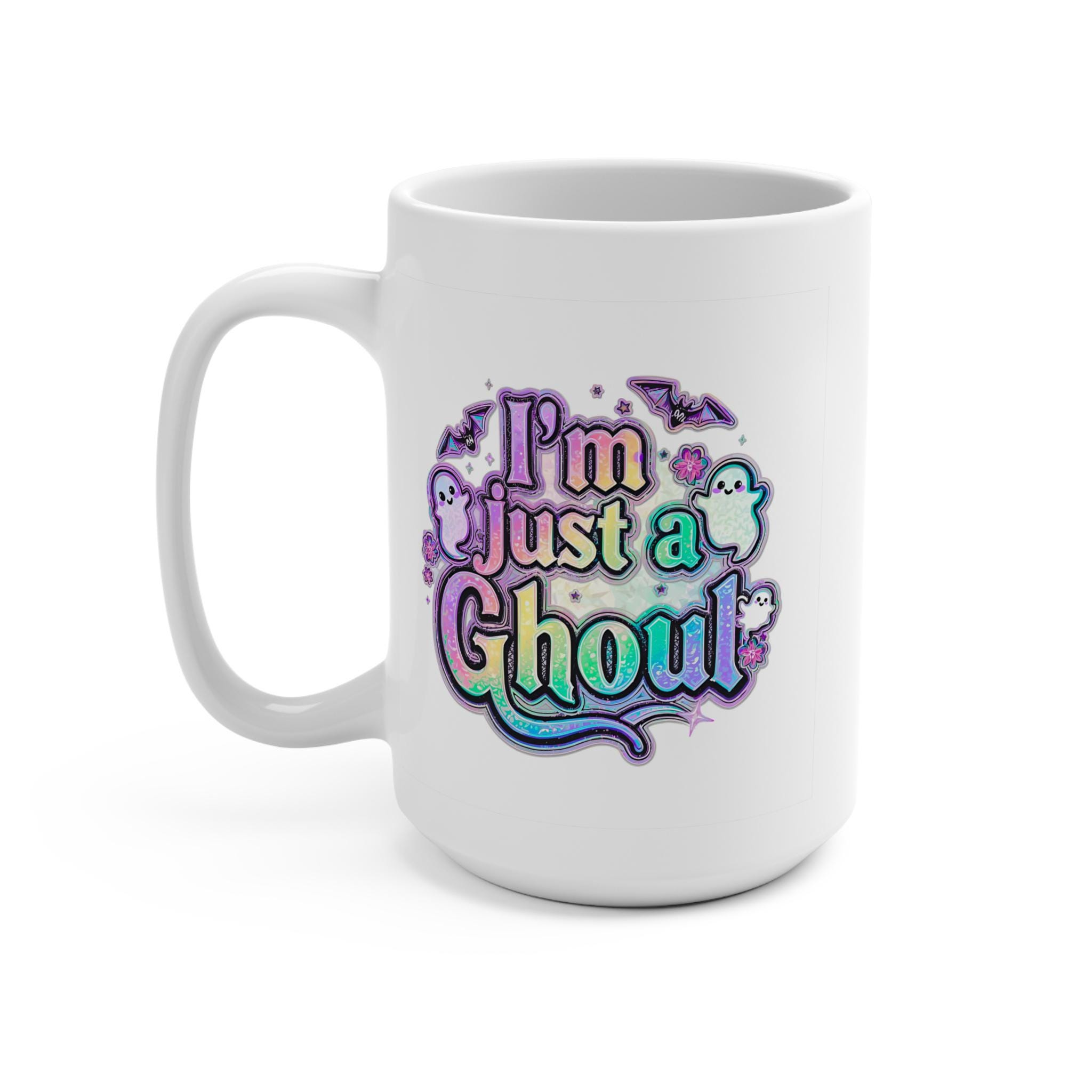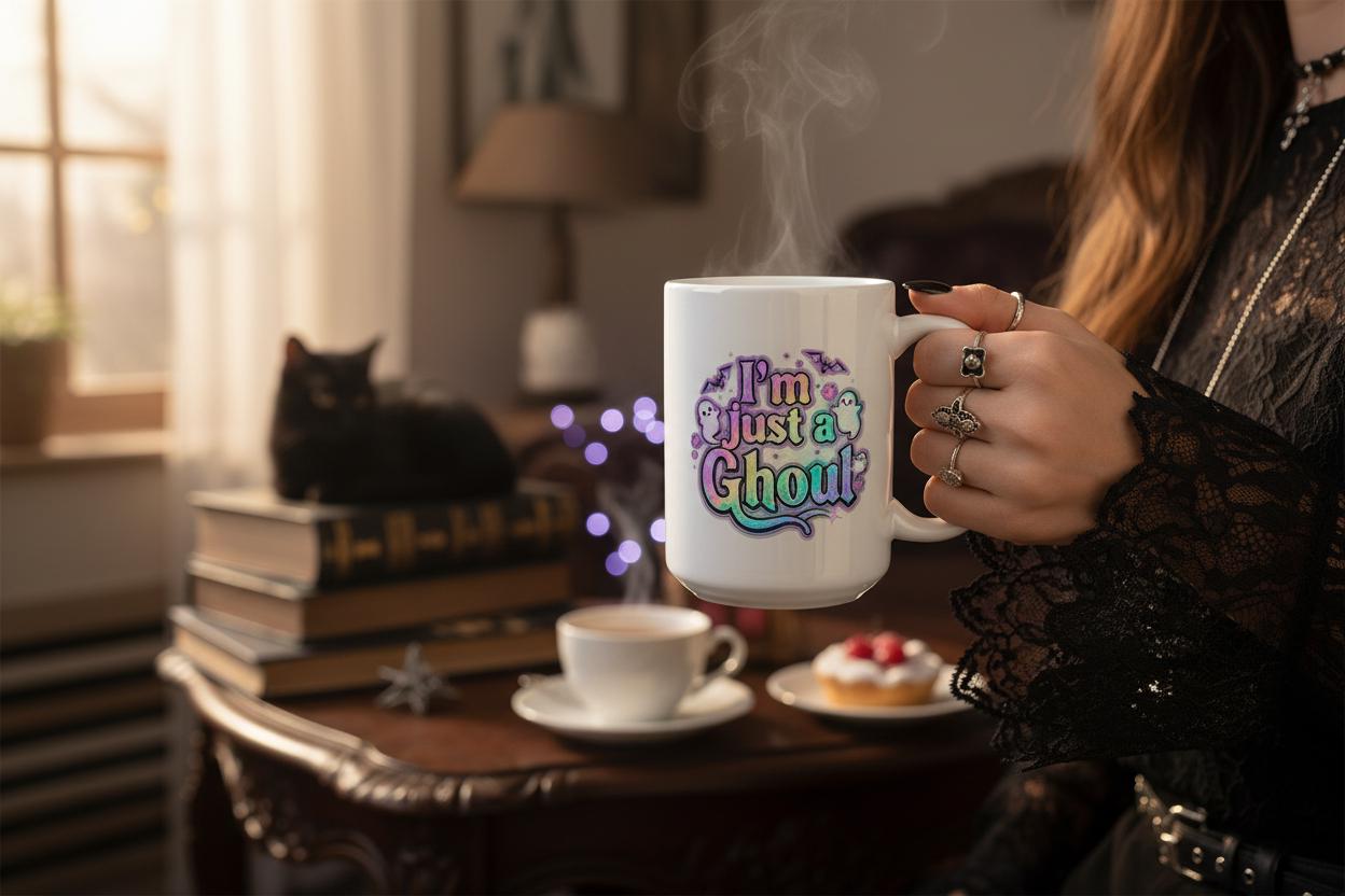 👻 Crisp white ceramic finish with bold black “I’m Just A Ghoul” design